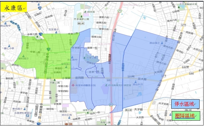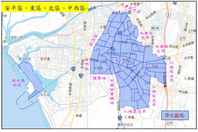 這次受影響的區域包含永康、安平、東區、中西區、北區等市區,也延伸到玉井、南化、大內、山上等山區,共 243,216 戶停水、78,703 戶水壓降低。其餘地區則維持正常供水。