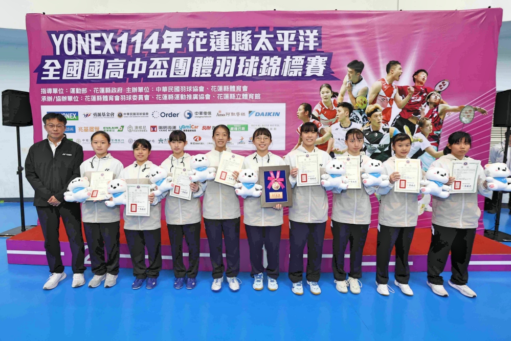 ▲114 年花蓮縣太平洋全國國高中盃團體羽球錦標賽,中華羽協秘書長林怡男(左1)頒獎土銀大毅光明A勇奪國中女子團體賽冠軍。(圖/中華羽協提供)