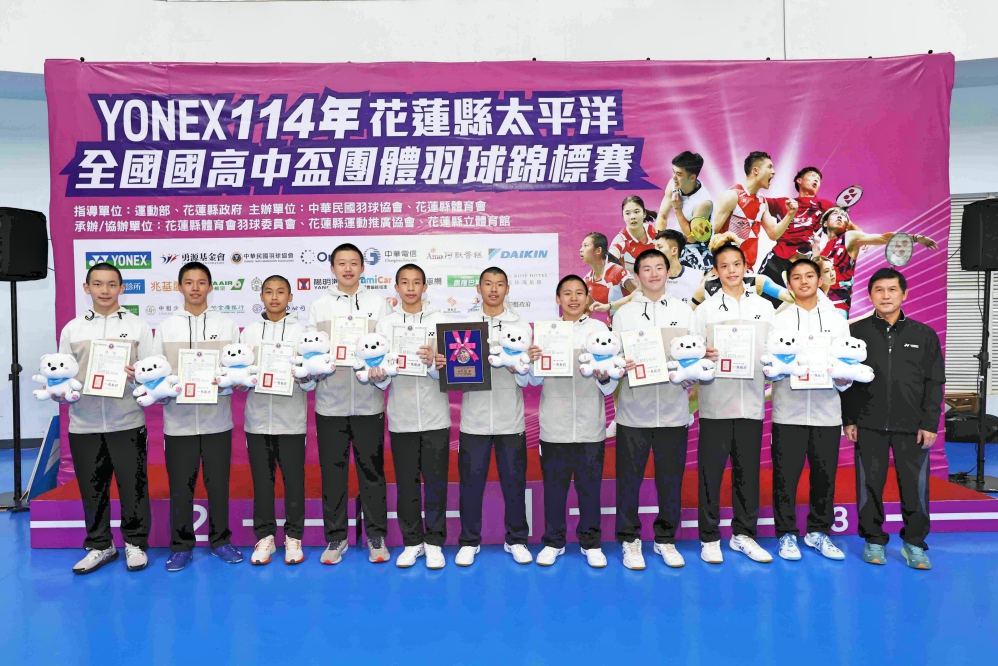 ▲114 年花蓮縣太平洋全國國高中盃團體羽球錦標賽,中華羽協選訓委員會主委張正憲(右1)頒獎土銀大毅光明A登上國中男子團體賽冠軍王座。(圖/中華羽協提供)