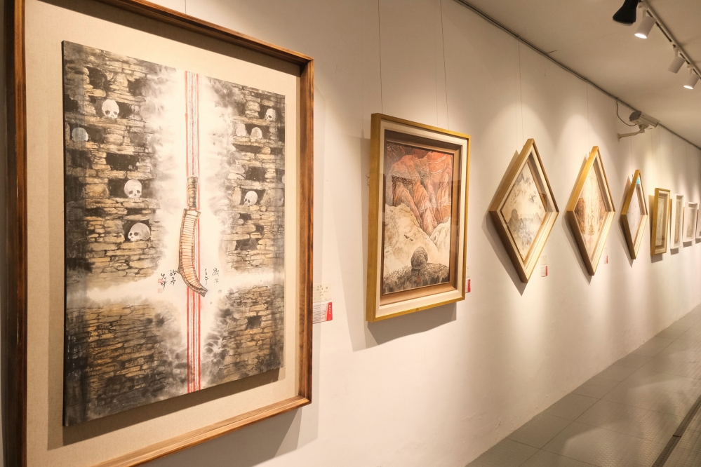 謝石鴻老師以巨幅書法作品《憶舊遊大霸山行》為主軸,藉由草書奔放的筆勢與植物染紙的天然肌理相互映襯,重現昔日登臨大霸尖山的震撼與心境。謝亞傑老師則運用書畫,捕捉大霸尖山不同角度山形的多元風貌,或巍峨高聳、或敦厚如酒桶、或形成愛心般的輪廓,呈現山水皴法中融入泰雅織布的圖騰語彙,開創具族群特色的「泰雅山水」。