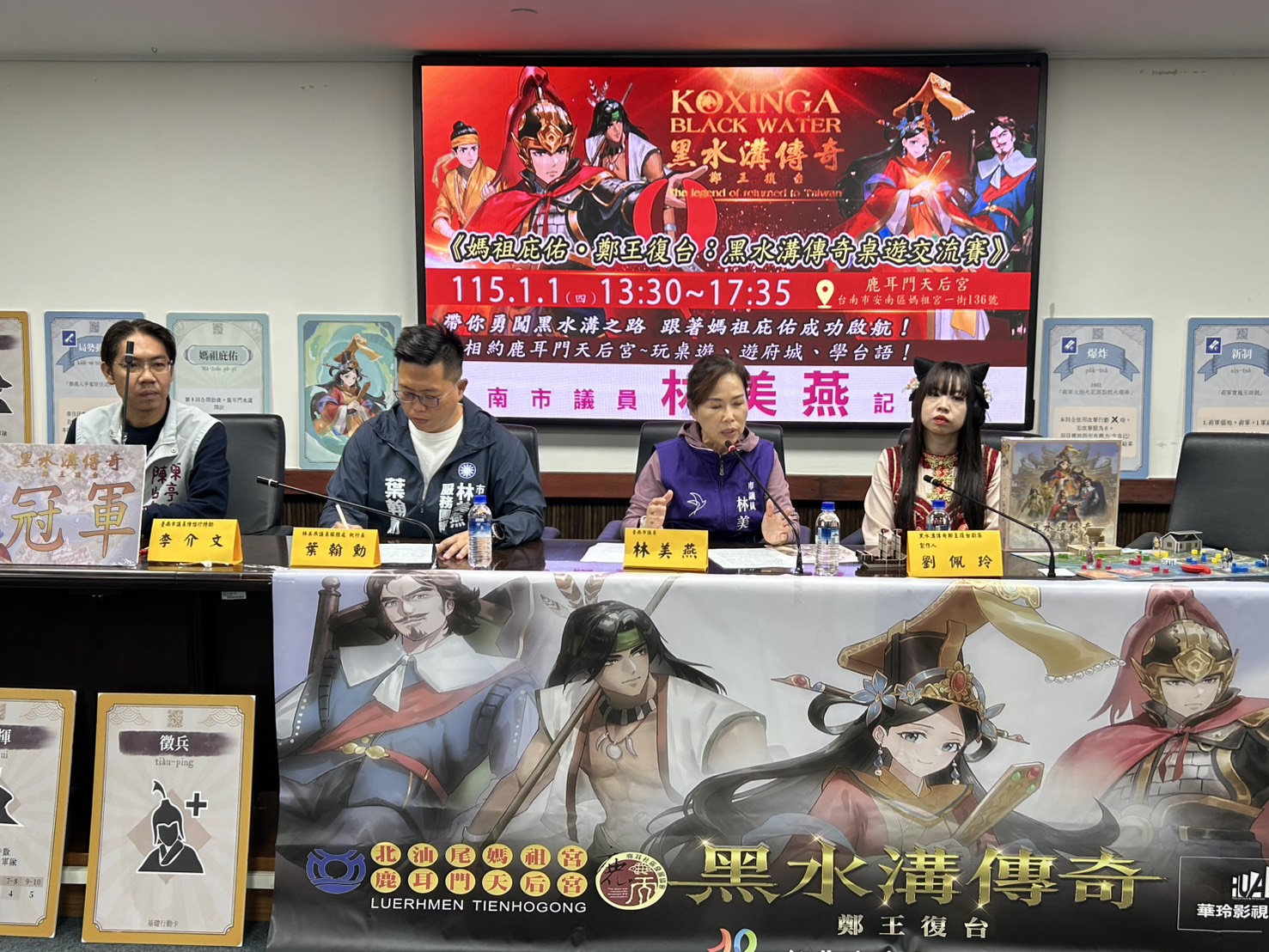 已在台北校園逐漸盛行的「黑水溝傳奇」桌遊,即將正式引進台南!市議員林美燕議員今(24)日協助此項桌遊遊戲的團隊舉辦記者會,共同宣布《媽祖庇佑・鄭王復台:黑水溝傳奇桌遊交流賽》,將於本月28日在安南區鹿耳門天后宮試玩,接著於明年1月1日舉辦正式桌遊交流賽,歡迎市民和遊客在桌遊遊戲中,認識台灣開發歷史與信仰文化。