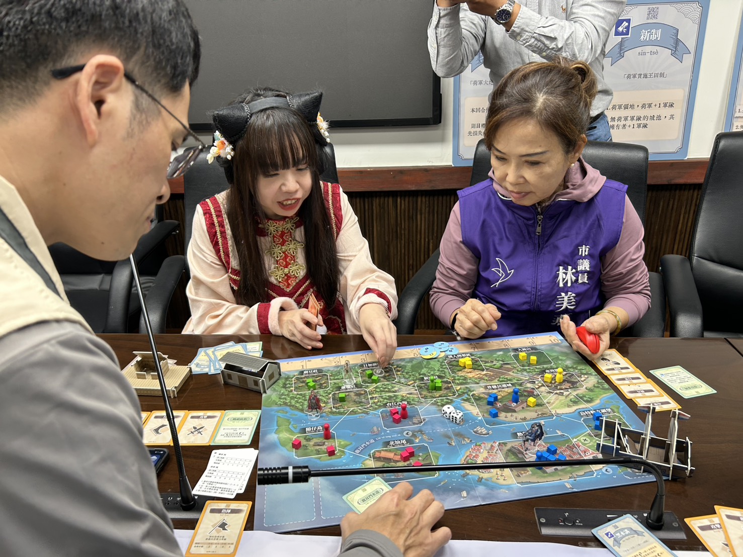 負責品牌設計團隊的張堂凱、陳郁鎂分別穿上鄭成功軍裝和阿美族服飾,讓會場揚添增了歷史的氛圍;劉佩玲更邀請林美燕議員、林美燕接班人葉翰勳及市府觀旅局副局長鄭道立實際試玩一回合,透過兵力、資源等調配,進行紙上地盤攻防戰鬥,大家玩得不亦樂乎。