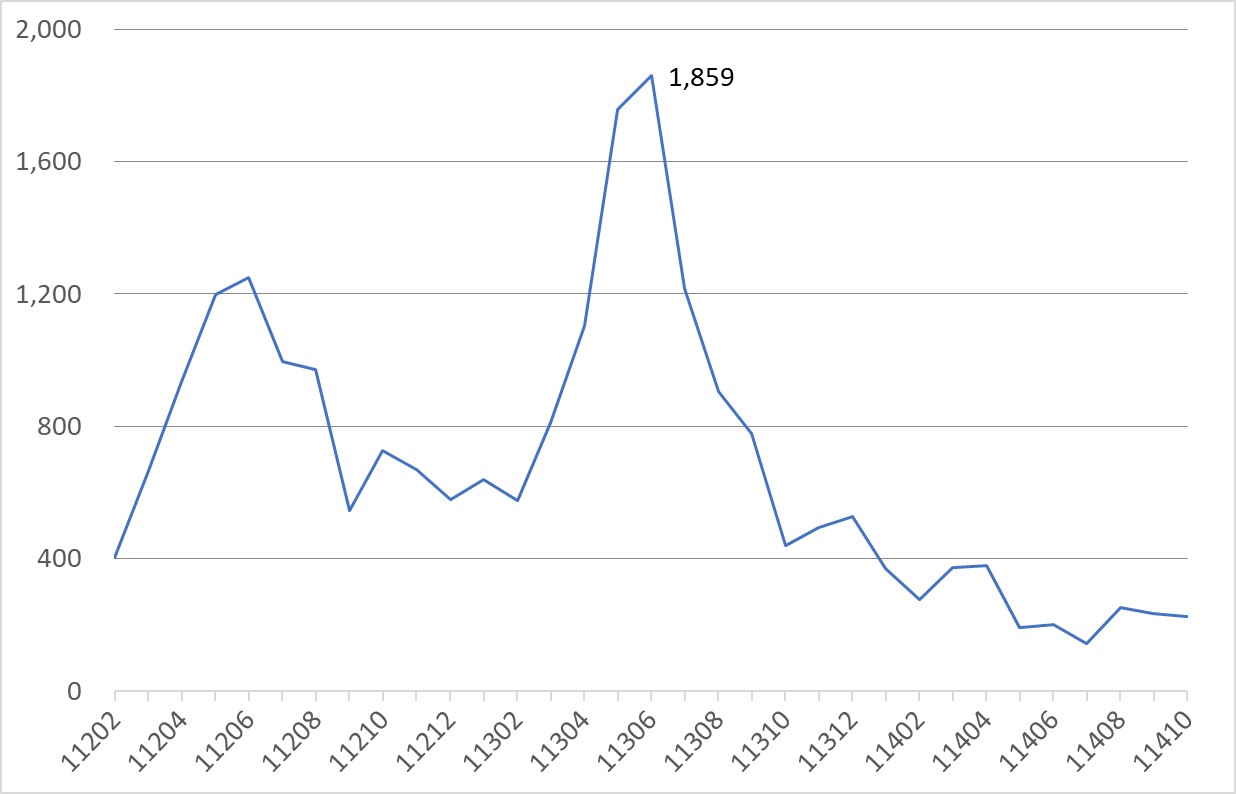 進一步觀察各行政區交易量表現,交易量前三名分別為永康區(269棟)、安南區(220棟)以及安平區(150棟)。與去年同期相比,安南區增幅明顯,本期交易量增加86.44%,主因區內新建案陸續完工,第一次移轉登記案量增加,本期第一次移轉棟數為125棟。相比之下,東區以及歸仁區交易量皆較去年同期下跌逾8成。再觀察預售屋實價登錄申報件數113年7月起已呈現逐步下修量縮態勢,本期與去年同期(113年10月)相比則呈現接近五成的減幅,顯示整體成交量仍處整理階段,交易動能有待後續觀察。