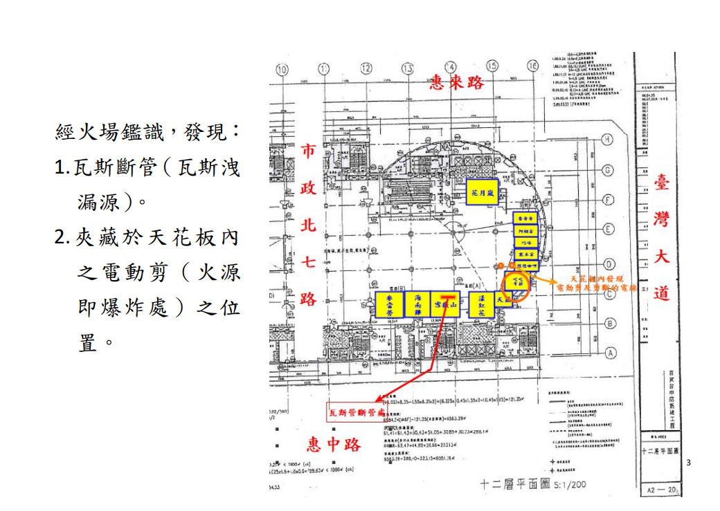 且陳姓被告等人於10時20分許,亦均知悉天花板內存有瓦斯管線,卻未聯繫瓦斯公司或調閱管線圖說,僅目視巡查並關閉部分分歧開關,仍疏未關閉12樓2處瓦斯總開關,致瓦斯主幹管持續供氣。嗣於同日10時48分許,李姓被告教操作怪手不慎扯落「雪嶽山」櫃位上方天花板內之瓦斯主幹管暨分歧管,因瓦斯總開關未關閉,瓦斯持續外洩並蓄積於天花板上方空間,致不知情之水電工人於11時33分許,在「想想咖哩」櫃位前使用電動電纜剪剪除電線時,因電纜剪運轉產生之火花引燃已達爆炸濃度之瓦斯,引發氣爆,最終造成5人死亡、35人受傷之重大公共安全事故。