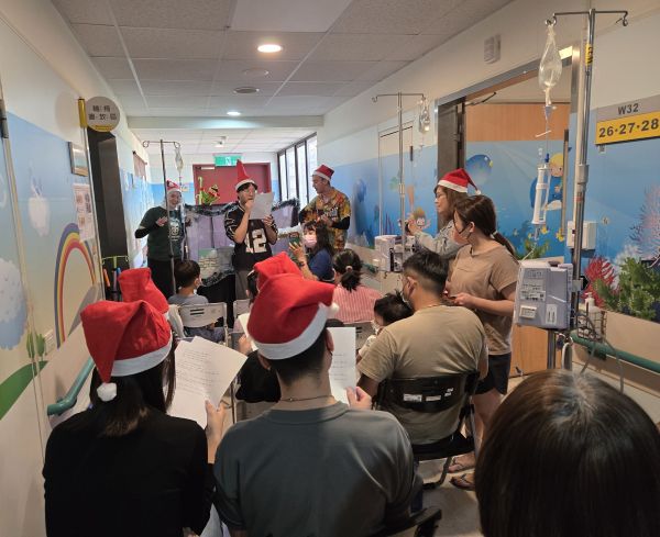 首場雙語手偶劇由外語教學系的外國學生與台灣學生共同演出,他們以精靈誤闖北極熊家庭的溫馨故事,引導孩童學習尊重他人。演出結束後,學生現場彈奏吉他,帶領大家合唱多首聖誕歌曲,病童與家屬跟著節奏搖鈴互動,場面氣氛溫馨。中場休息時,大學生陪伴孩童進行繪畫活動,為手偶角色塗上色彩,並在聊天中拉近彼此距離,也讓病童短暫忘卻身體的不適。
