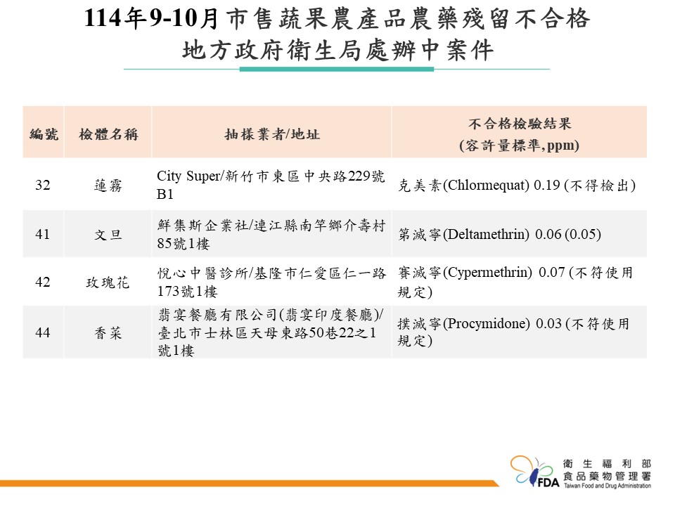 【Lai傳媒、記者爆料網/謝建成/台北報導】年末聚餐旺季來臨,大家外食頻率飆高,但吃進嘴裡的蔬果是否安全?衛福部食藥署今(31)日公布「114年度市售蔬果農藥殘留監測」9~10月結果,檢驗超過800件市售蔬果,竟有45件農藥殘留不合格,多家知名餐廳、飲料店、量販賣場全都中鏢,引發民眾關注。