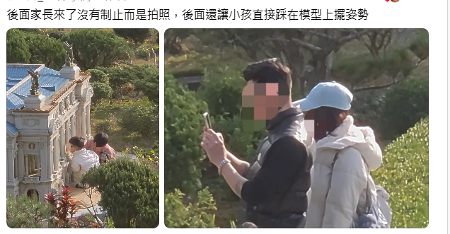有民眾假日到小人國遊玩,發現有小孩衝進模型區亂摸搞破壞,家長沒有制止還拍照,引起熱議。