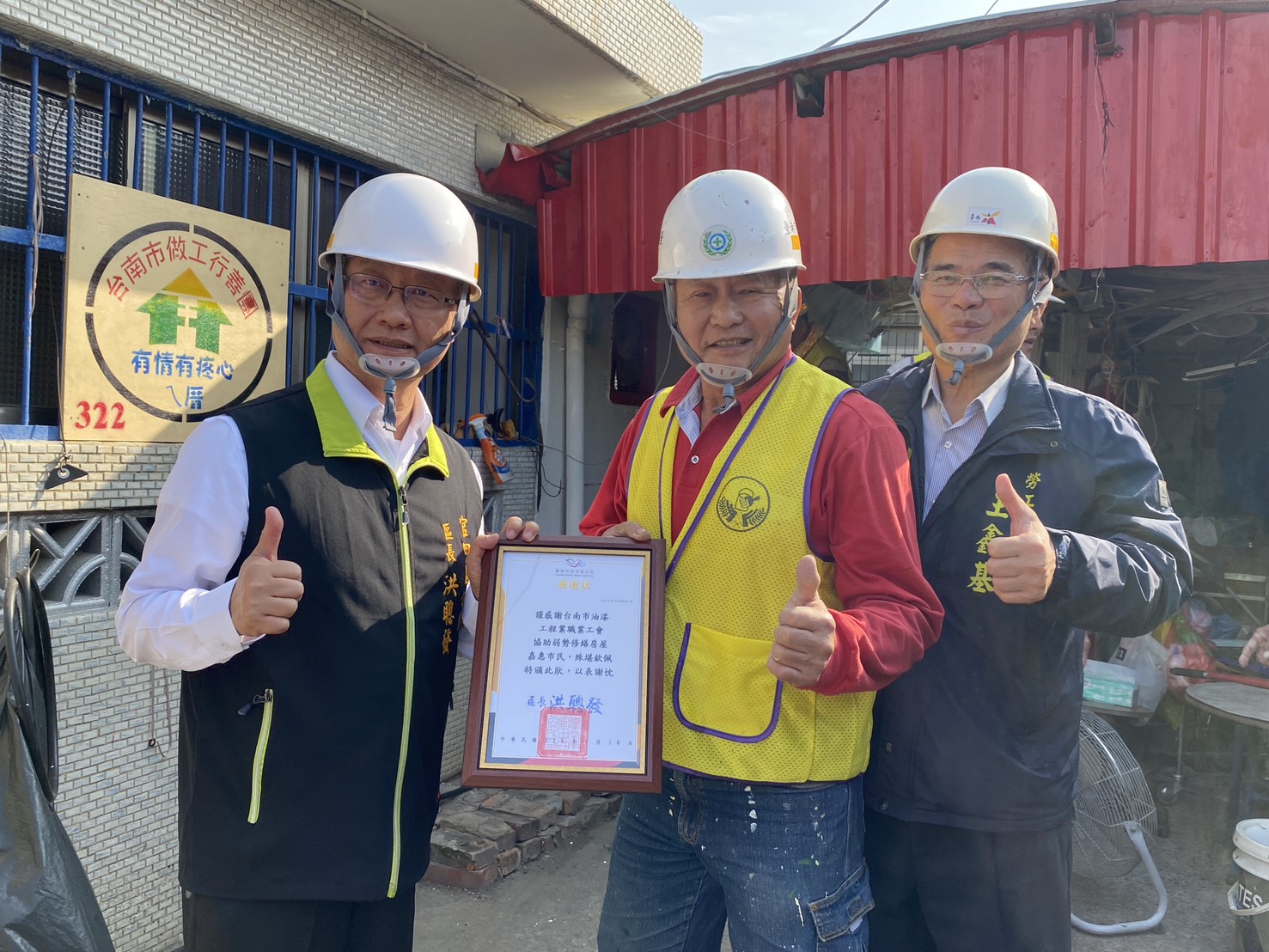 ▲官田區長洪聰發致贈感謝狀給「做工行善團」油漆工會志工,感謝他們幫助弱勢修屋。(勞工局 提供)
