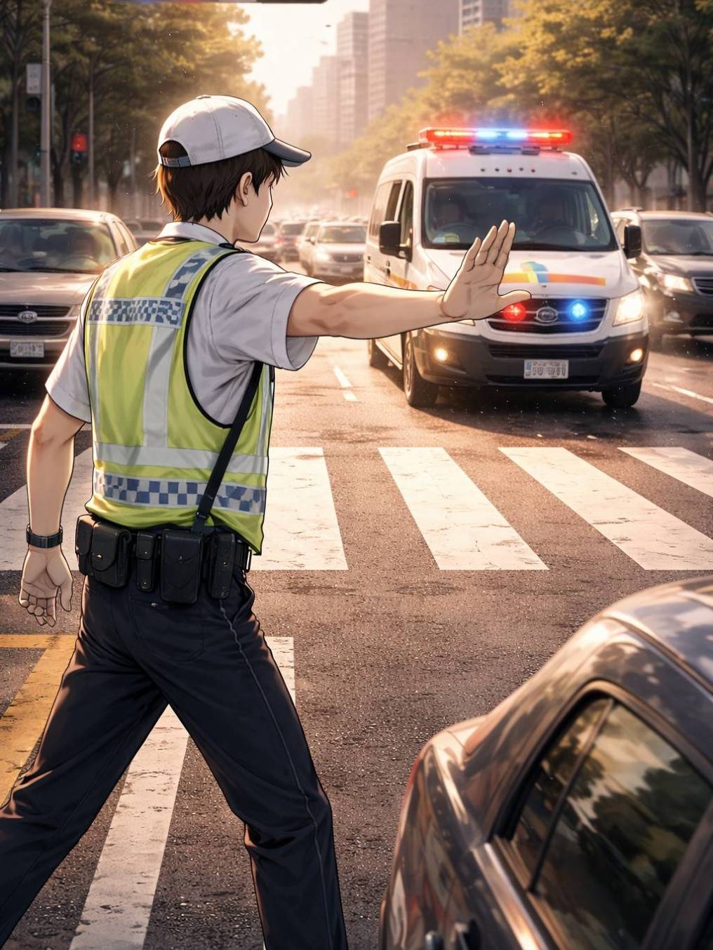 在十字路口,一輛救護車高速接近,而號誌即將轉換。就在此時,一位義工交警毫不猶豫地站了出來。他沒有多想,沒有退縮,直接伸出手,擋在準備左轉的車流前方。那一秒,沒有英雄配樂,沒有掌聲,甚至沒有人特別注意他是誰。但我知道,那是一個把「別人的命」放在「自己安危」之前的選擇。