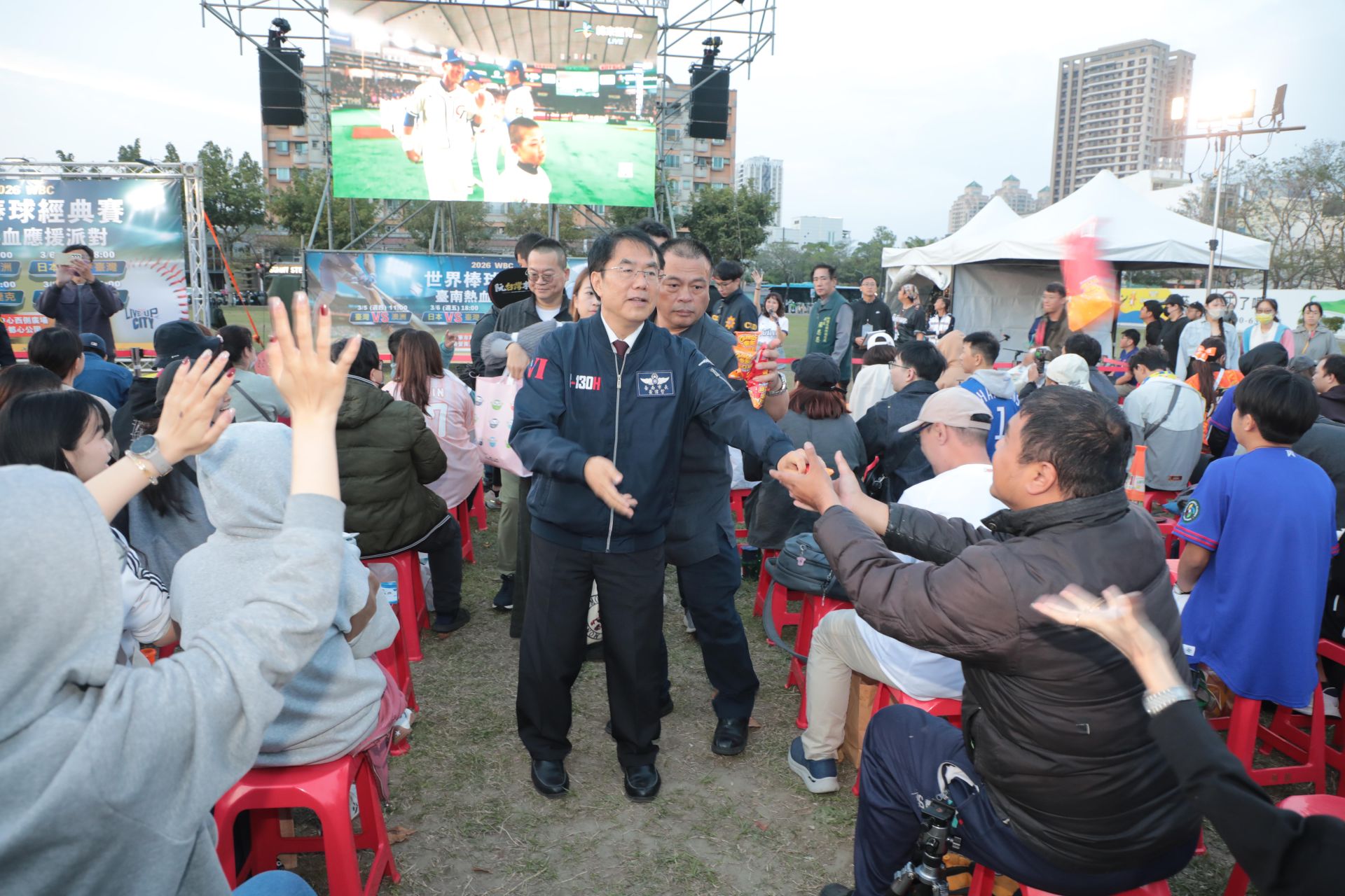 市長黃偉哲親臨與民眾一起為台灣加油,現場發送補給點心給到場支持的球迷。