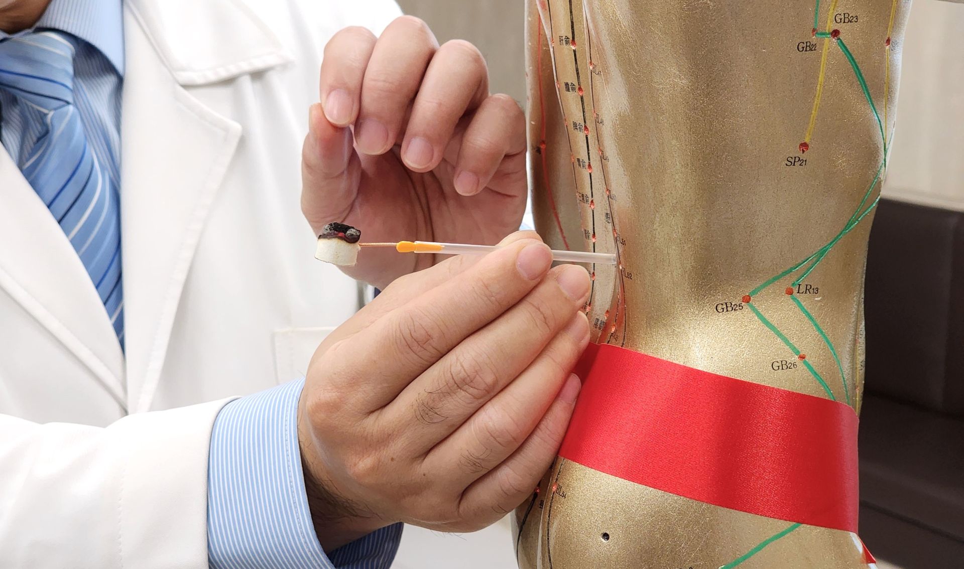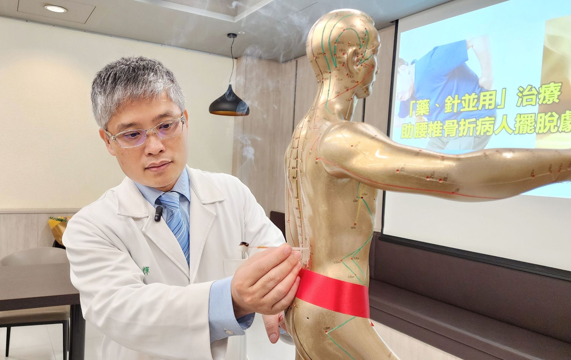 中醫部骨傷科主任任東輝示範「針上灸」治療,針對第二腰椎的「命門穴」進行深層溫通,協助活化局部循環、放鬆深層筋膜並強化氣血流通