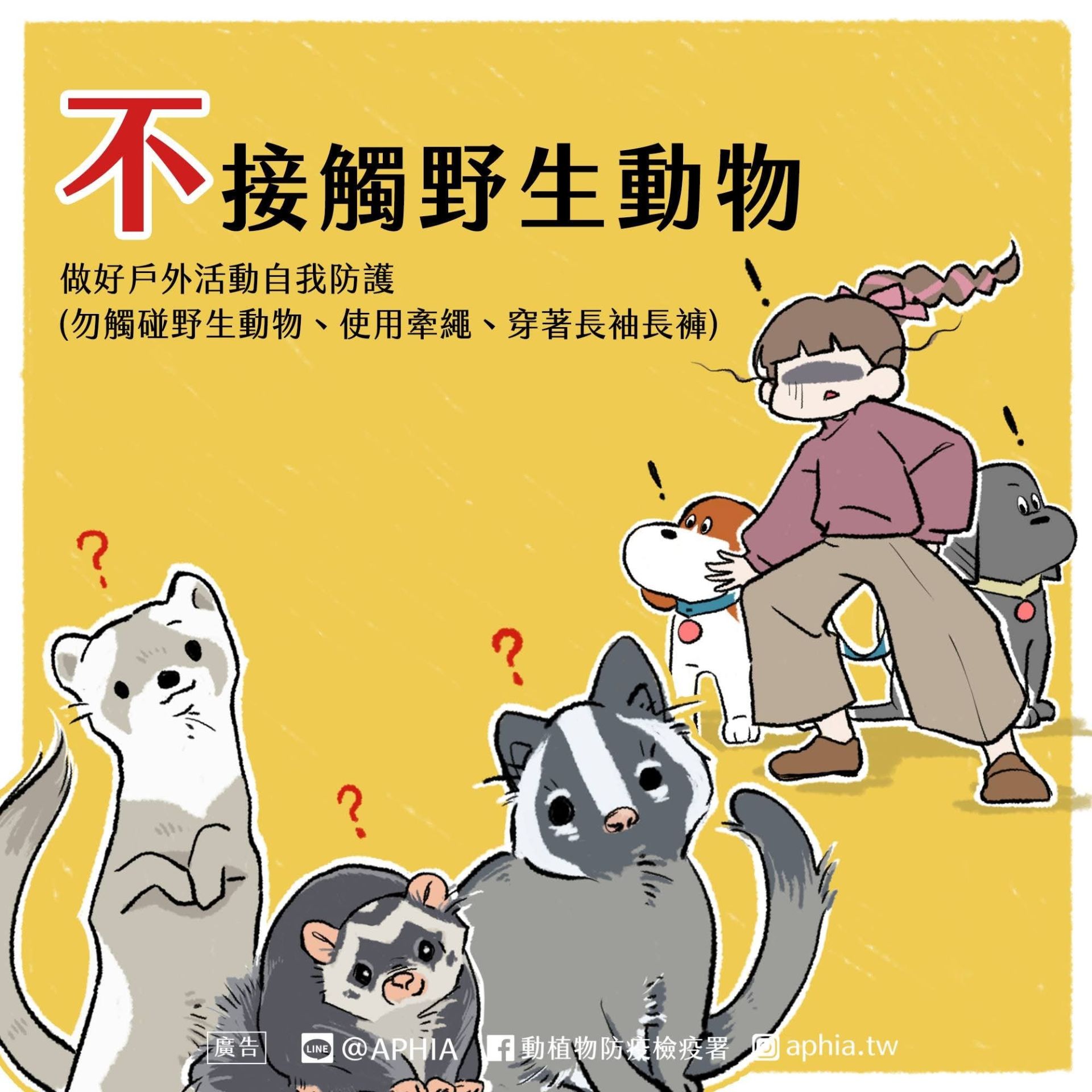 呼籲民眾落實「防範狂犬病二不一要」原則,包括不接觸野生動物、不棄養寵物,以及每年定期帶犬貓施打狂犬病疫苗,共同守護人畜安全。另提醒,未依規定完成犬貓狂犬病疫苗注射者,依法可處新臺幣3萬元至15萬元罰鍰。