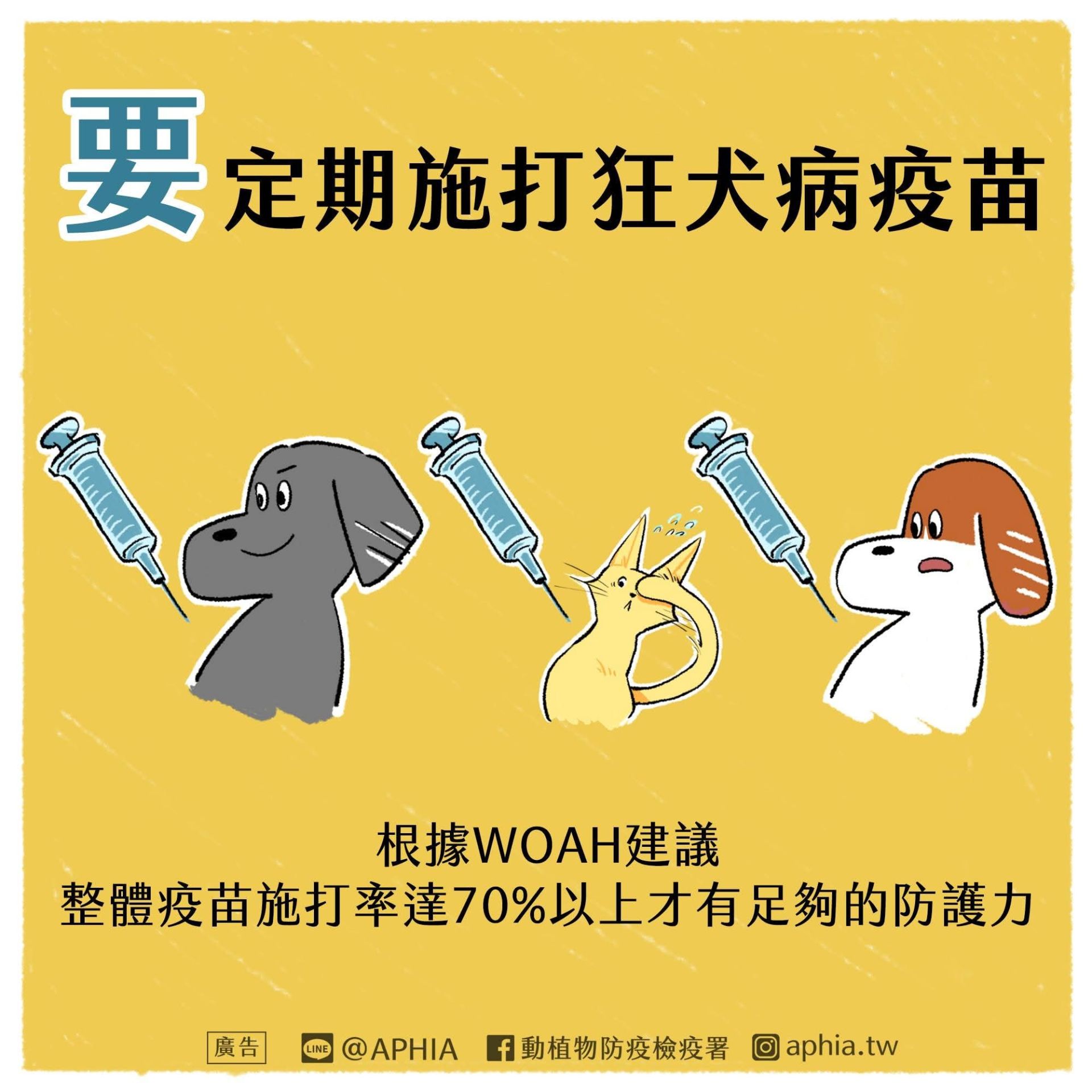 動防所強調,狂犬病為人畜共通傳染病,一旦發病致死率極高,透過定期疫苗接種即可有效預防,請飼主務必提高警覺,踴躍配合施打。