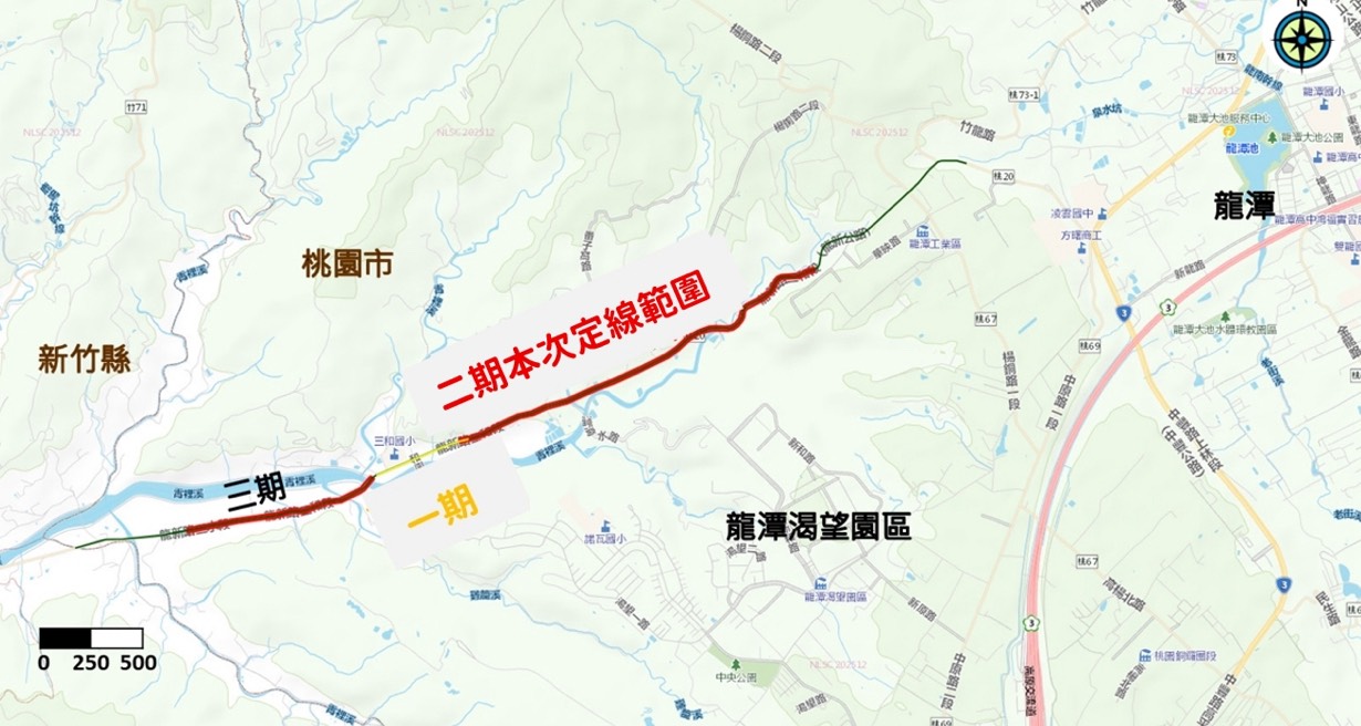 因應龍潭科學園區未來擴建發展,預計提供4,500人就業機會,屆時整體交通量將隨之增加,因此市府提前規劃區外聯絡道路,以維持交通運轉順暢並提供用路人更多元的路線選擇。工務局補充,第一期「龍潭區龍新路三和段道路拓寬(直坑尾橋至三和段1240巷)」工程,全長約490公尺,規劃將原有道路拓寬至8公尺,預計在本(4)月28日開工,116年初完工。本次二期計畫起自龍新路三和段(桃20)1240巷,終點至台電電桿三分水線21(B2200FA88)處,道路長度約為1,993公尺,計畫寬度設計為8公尺,配置路肩與混合車道,最高行車速率設定為每小時30~40公里,並在規劃過程中秉持避免房屋拆遷及減少劃分畸零地等為核心原則,後續並將持續規劃自龍新路三段1號銜接至龍新路三和段(直坑尾橋)的第三期計畫。