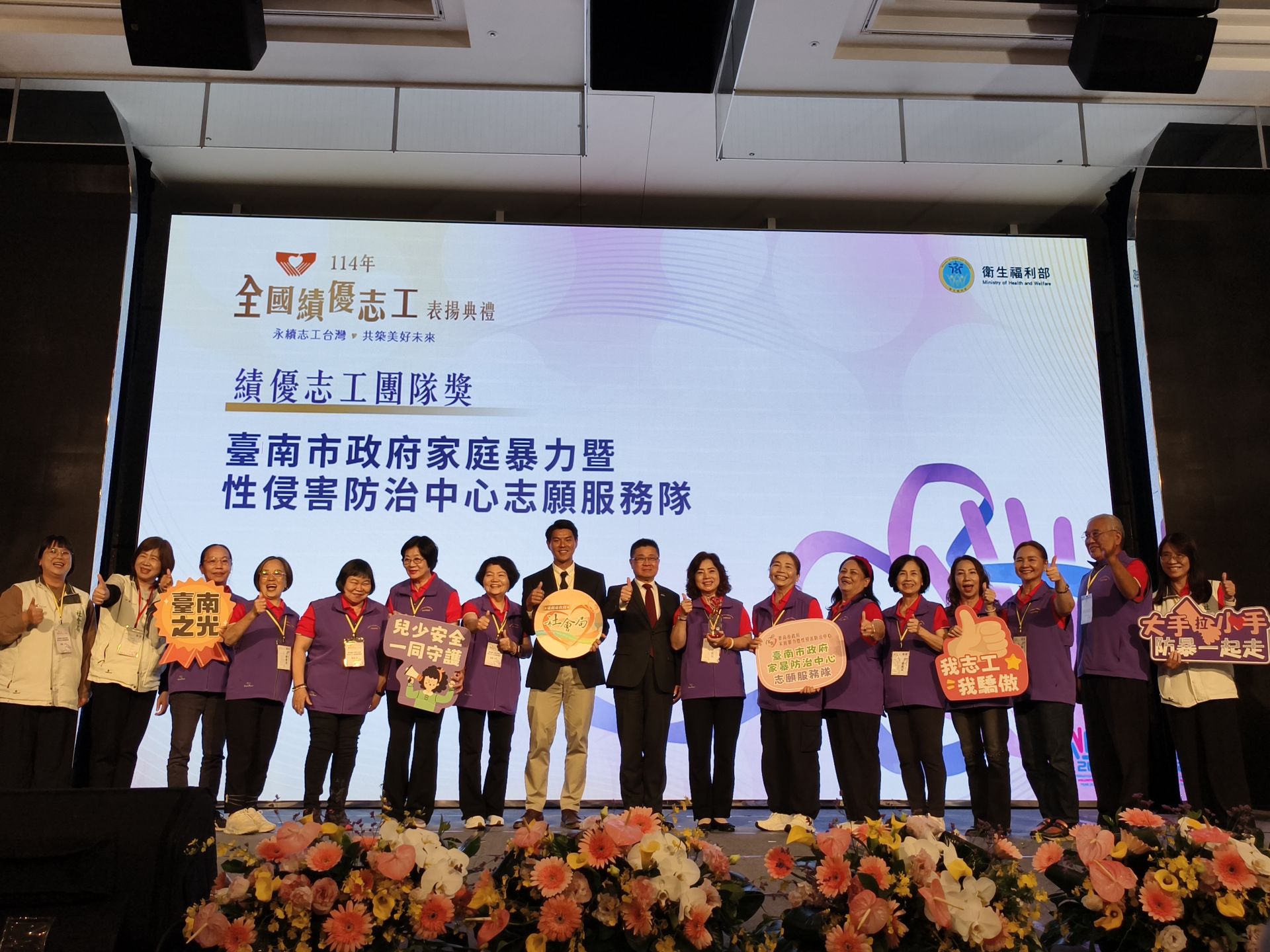 明(5)日為國際志工日(International Volunteer Day),這個節日為聯合國於西元1985年訂定,旨在表揚志工的無私奉獻,並鼓勵更多民眾投入志願服務。衛生福利部響應此理念於11月28日假大直典華幸福大樓舉辦114年全國績優志工表揚典禮,臺南市政府家庭暴力暨性侵害防治中心志願服務隊榮獲「全國績優志工團隊獎」,由衛生福利部呂建德政務次長親自頒獎。黃偉哲市長特獻花祝賀,並由家暴防治中心楊逸宏主任代表到場,感謝志工夥伴長期協助市府投入防治工作。