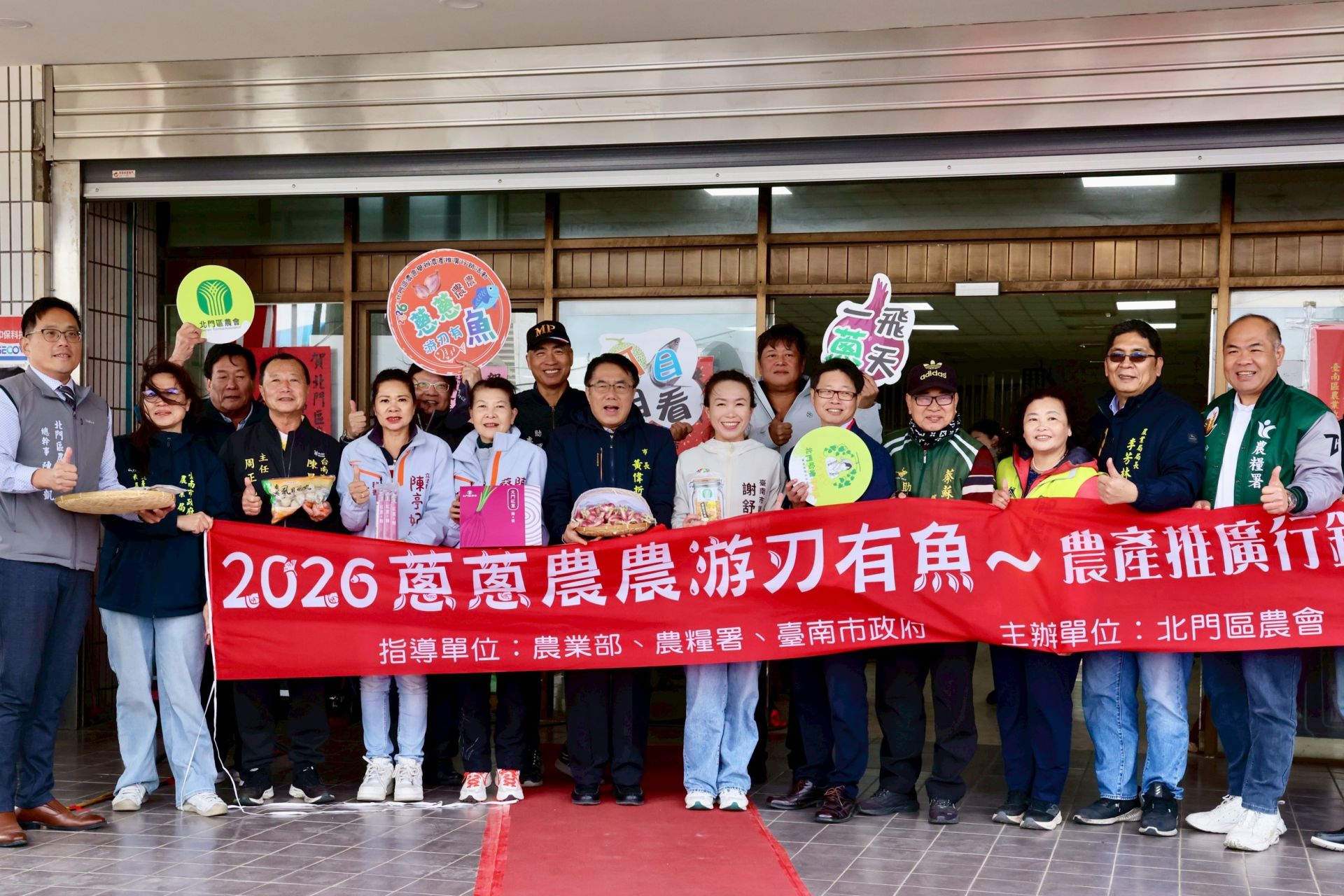 市長黃偉哲與北門區農會、地方民代及來賓共同出席「2026 蔥蔥農農 游刃有魚~農產推廣行銷活動」,為紅蔥頭及在地農產行銷站台。