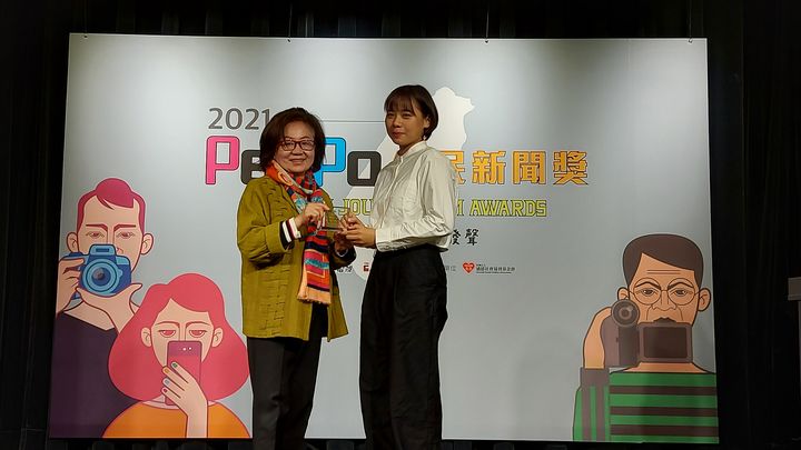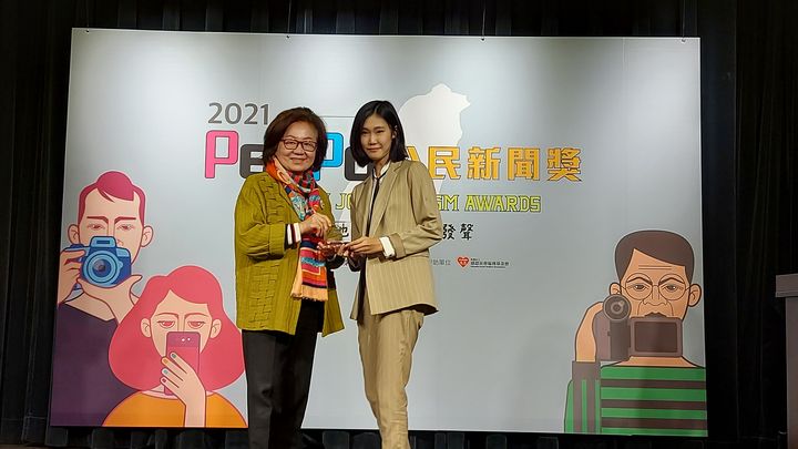 ▼公視董事長陳郁秀(左)與南臺科大獲獎同學房佳潁(右)於「公共電視Peopo公民新聞獎」頒獎典禮合影。(南台科大提供)