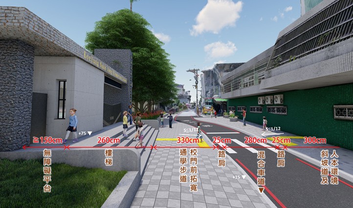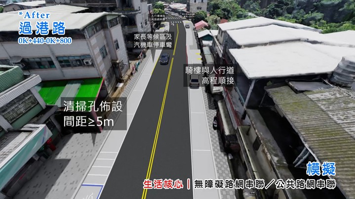 至於整個規劃設計成果如何?工務處表示,纜線清理、夜間明亮、道路平整、排水改善等等都早就已經是基本要求,因此上述這些已不是特點,這次設計案最重要的,在於設計重心以暖江國小為核心,從學生上下學的需求出發,並搭配周邊的住商生活區域,讓整體動線更貼切過港社區居民的一日出入需求。